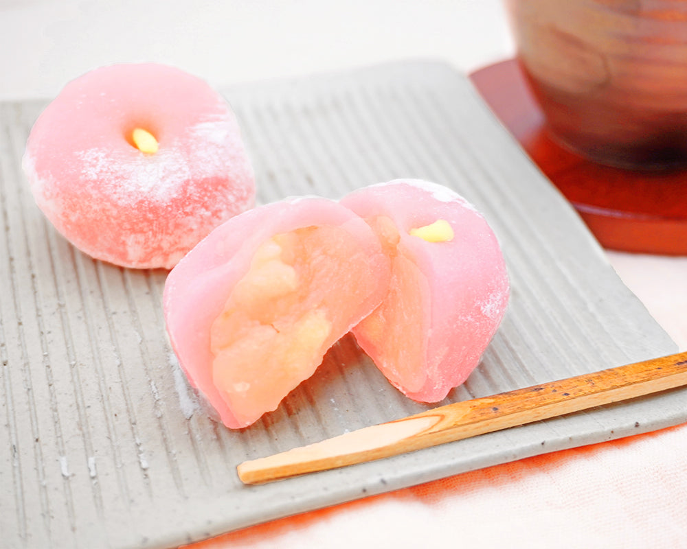 生の林檎から丁寧に炊き上げた自家製のりんご餡を大福で包みました。りんご餡の優しい甘さと果実の香りをお楽しみください。